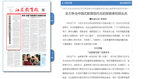 | 江苏教育报:习近平总书记在参加江苏代表团审议时的重要讲话引起全省教育系统热烈反响——全力争当中国式教育现代化的探路者和排头兵 |