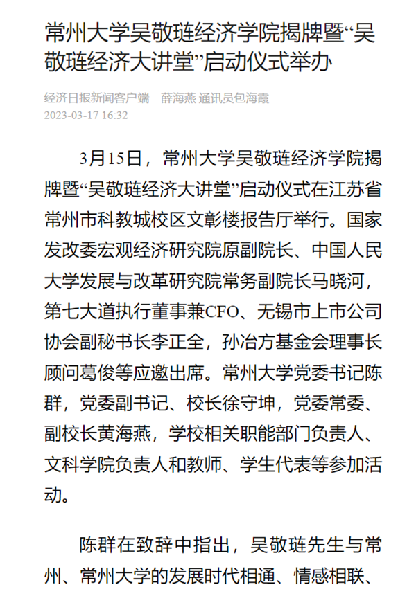 | 经济日报:常州大学吴敬琏经济学院揭牌暨“吴敬琏经济大讲堂”启动仪式举办 |