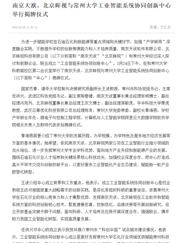 | 交汇点:南京天洑、北京眸视与常州大学工业智能系统协同创新中心举行揭牌仪式 |