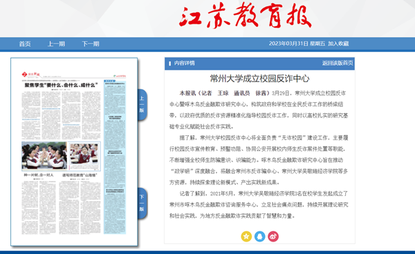 | 江苏教育报:常州大学成立校园反诈中心 |