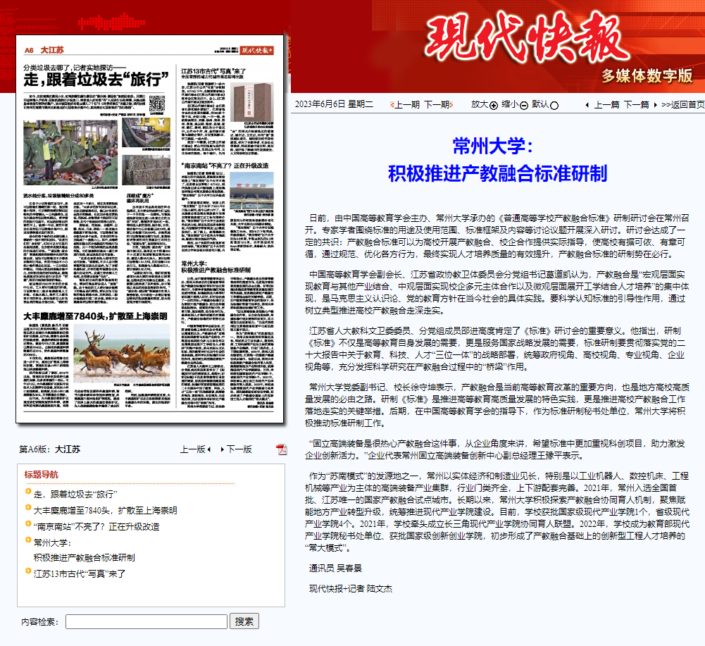 | 现代快报:常州大学: 积极推进产教融合标准研制 |