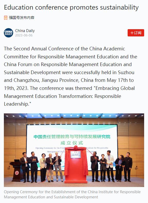 The Second Annual Conference of the China Academic Committee for Responsible Management Education and the China Forum on Responsible Management Education and Sustainable Development were successfully held in Suzhou and Changzhou, Jiangsu Province, China from May 17th to 19th, 2023. The conference was themed Embracing Global Management Education Transformation: Responsible Leadership.