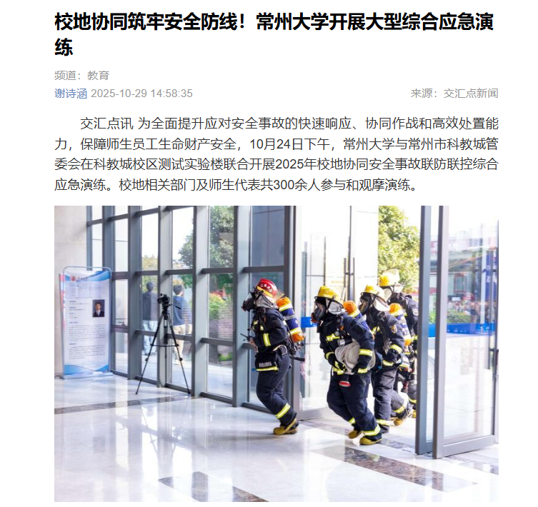 | 交汇点新闻:校地协同筑牢安全防线!常州大学开展大型综合应急演练 |