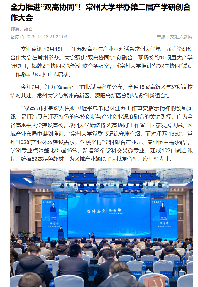 | 交汇点新闻:全力推进“双高协同”!常州大学举办第二届产学研创合作大会 |