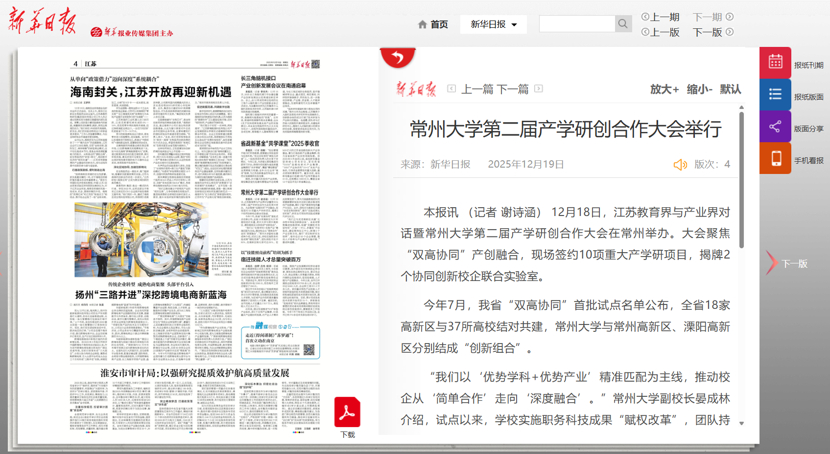 | 新华日报:常州大学第二届产学研创合作大会举行 |