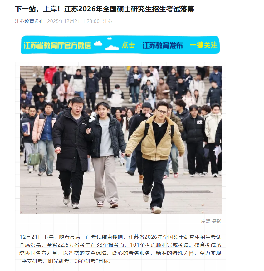 | 江苏教育发布:下一站,上岸!江苏2026年全国硕士研究生招生考试落幕 |