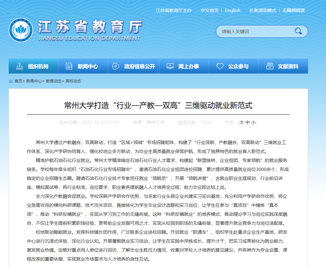 | 江苏教育厅官网:常州大学打造“行业—产教—双高”三维驱动就业新范式 |