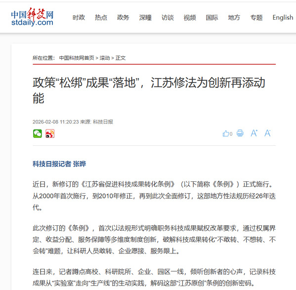 | 中国科技网:政策“松绑”成果“落地”,江苏修法为创新再添动能 |
