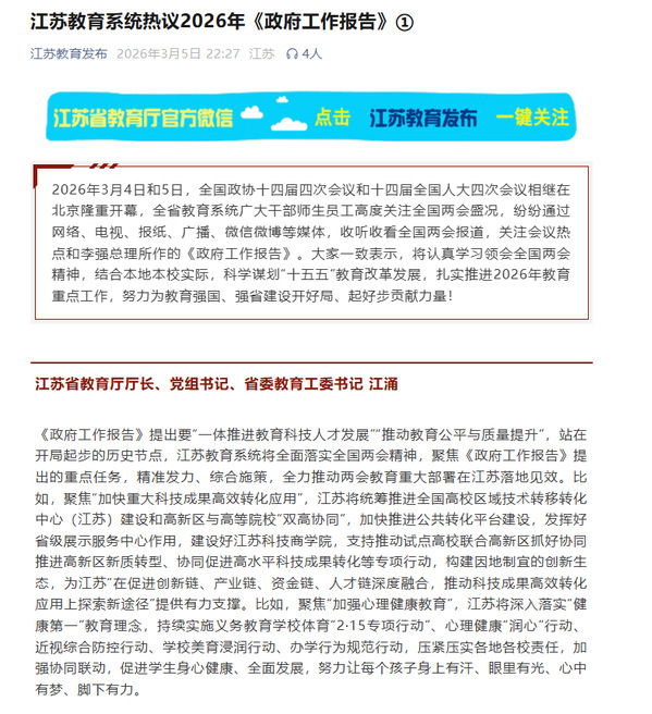 | 江苏教育发布(微信):江苏教育系统热议2026年《政府工作报告》① |