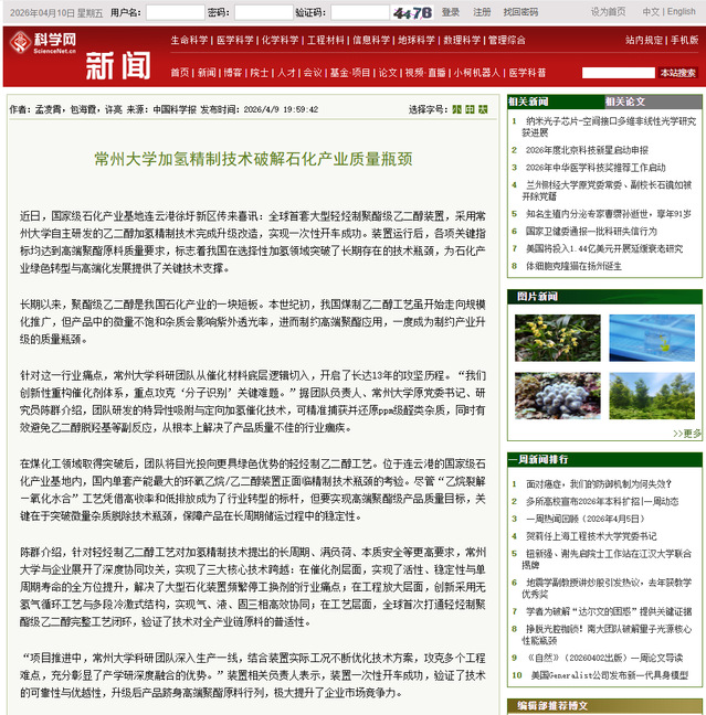 | 中国科学网:常州大学加氢精制技术破解石化产业质量瓶颈 |