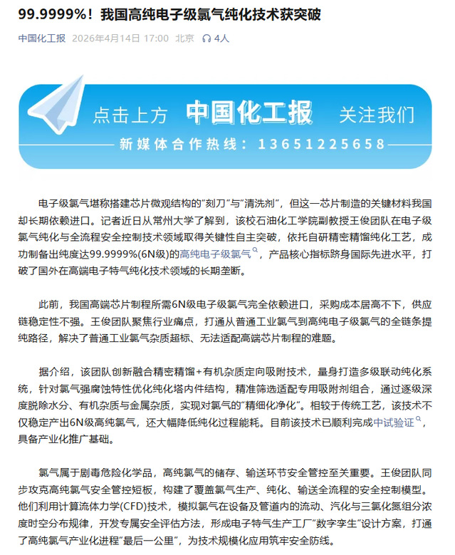 | 中国化工报:99.9999%!我国高纯电子级氯气纯化技术获突破 |