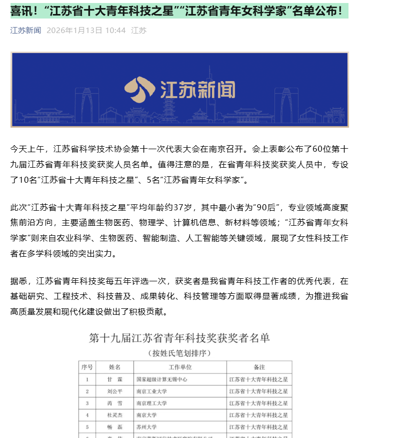 江苏新闻:喜讯!“江苏省十大青年科技之星”“江苏省青年女科学家”...